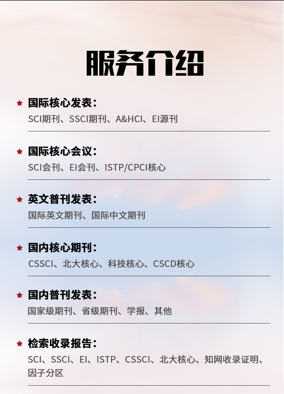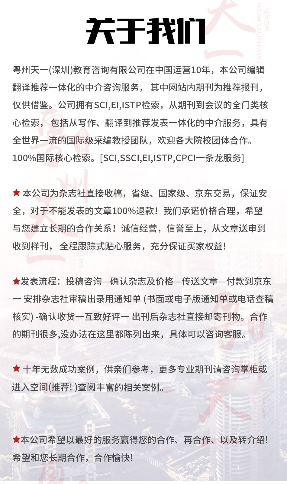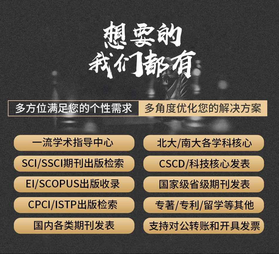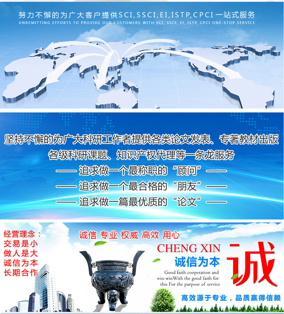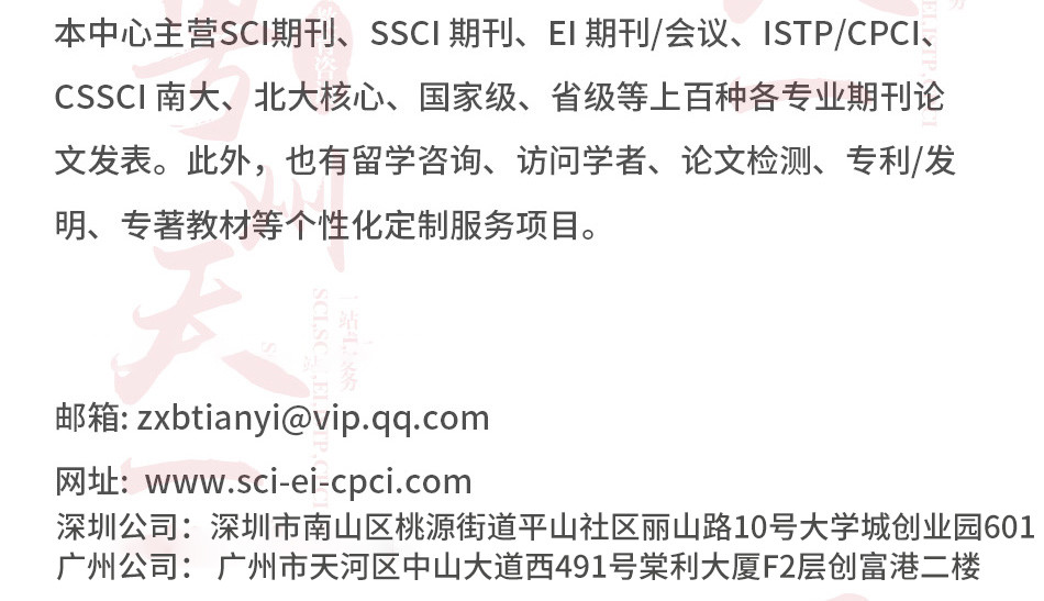 廣州愛燃知心教育咨詢有限公司在中國運營10餘年,本公司編輯 翻譯 推薦一體(tǐ)化的中介咨詢服務,其中網站(zhàn)內(nèi)期刊為(wèi)推薦報刊,僅供借鑒。公司擁有(yǒu)SCI,EI,ISTP檢索和(hé)北大(dà)核心、南大(dà)核心、CSCD及科技(jì)核心從期刊到會(huì)議的全門(mén)類核心檢索,包括從寫作(zuò)、翻譯到推薦發表一體(tǐ)化的中介服務,具有(yǒu)全世界一流的國際級采編教授團隊,歡迎各大(dà)院校(xiào)團體(tǐ)合作(zuò)。100%國際核心檢索。