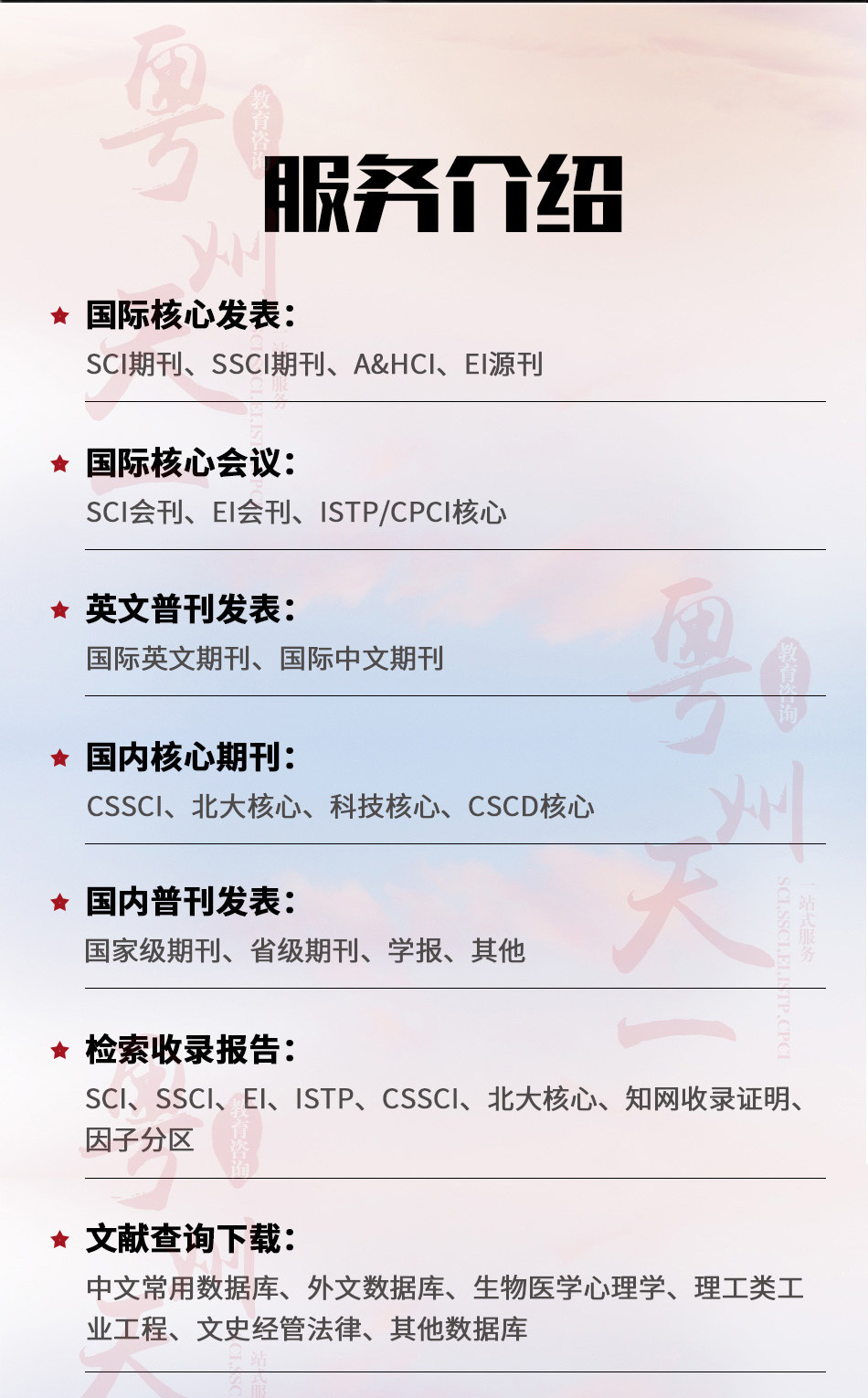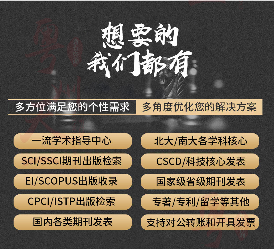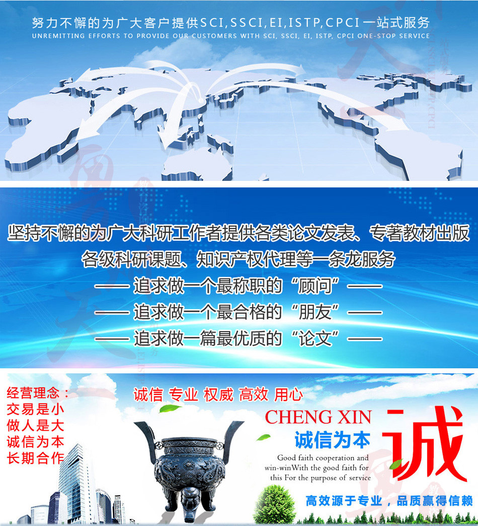 廣州愛燃知心教育咨詢有限公司在中國運營10餘年,本公司編輯 翻譯 推薦一體(tǐ)化的中介咨詢服務,其中網站(zhàn)內(nèi)期刊為(wèi)推薦報刊,僅供借鑒。公司擁有(yǒu)SCI,EI,ISTP檢索和(hé)北大(dà)核心、南大(dà)核心、CSCD及科技(jì)核心從期刊到會(huì)議的全門(mén)類核心檢索,包括從寫作(zuò)、翻譯到推薦發表一體(tǐ)化的中介服務,具有(yǒu)全世界一流的國際級采編教授團隊,歡迎各大(dà)院校(xiào)團體(tǐ)合作(zuò)。100%國際核心檢索。